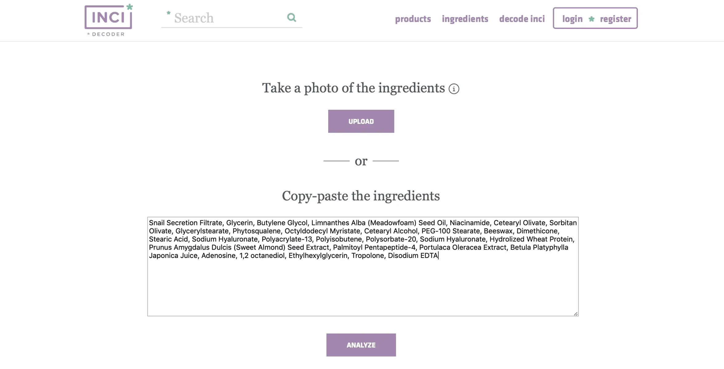 Alternativ: Bei ‚decode inci‘ (oben) selbst Inhaltsstoffe reinkopieren (copy-paste) oder abfotografieren.